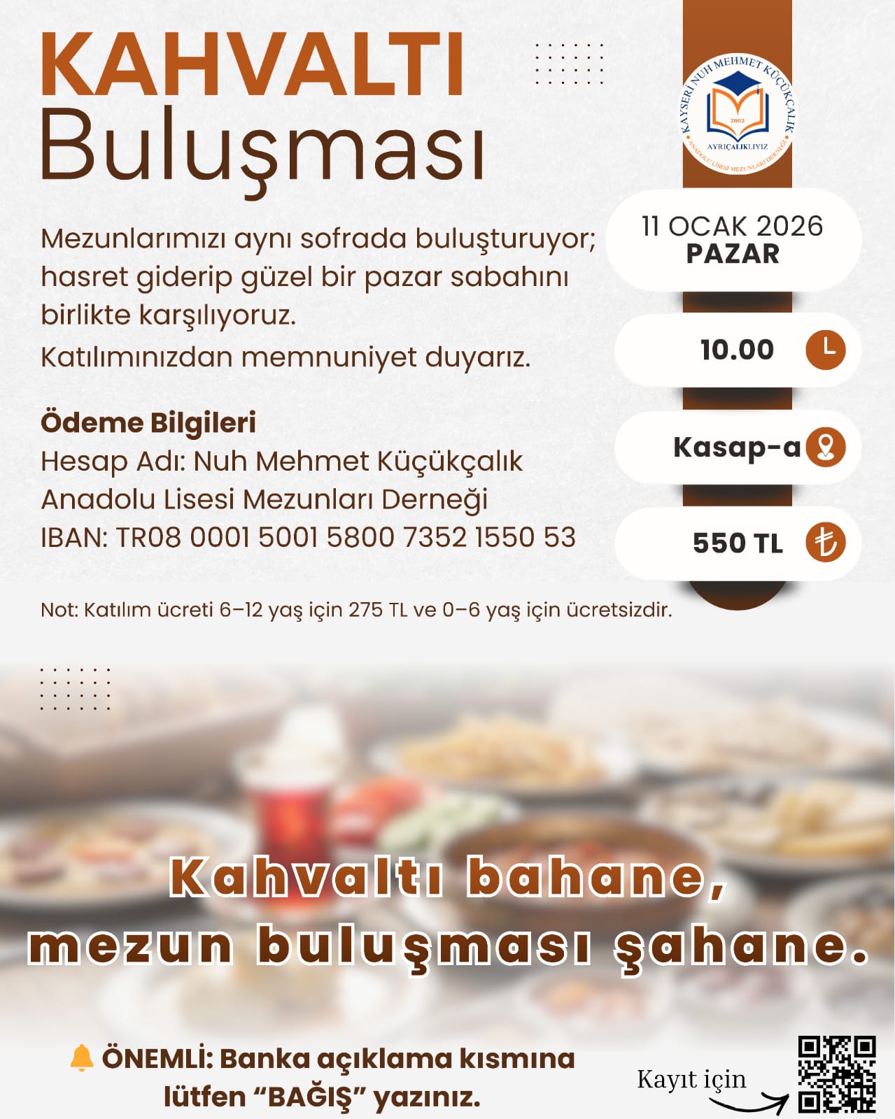 Nuh Mehmet Küçükçalık Anadolu Lisesi Mezunları Derneği olarak yeni yıla birlikte merhaba demek için bu pazar kahvaltıda buluşuyoruz ☕